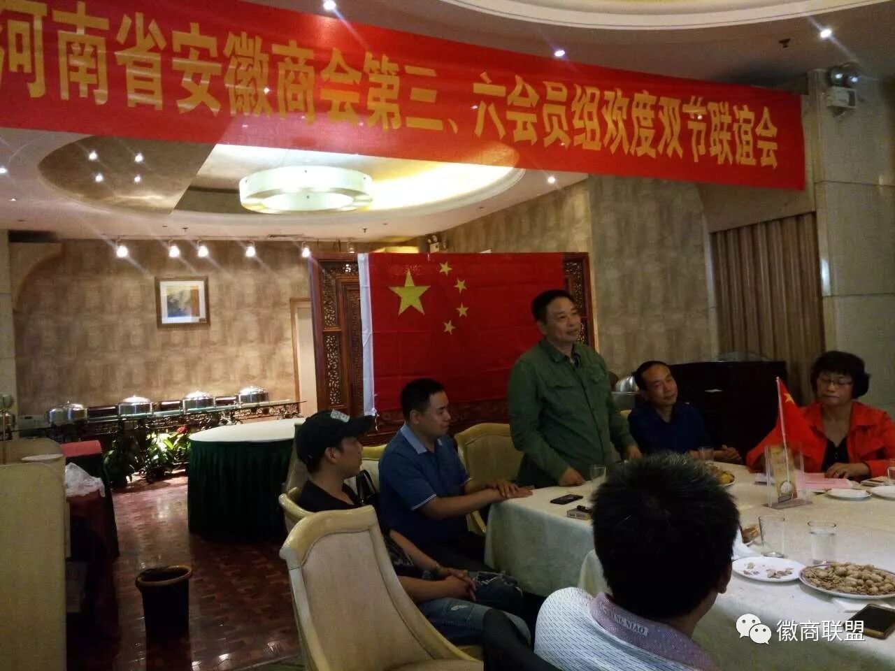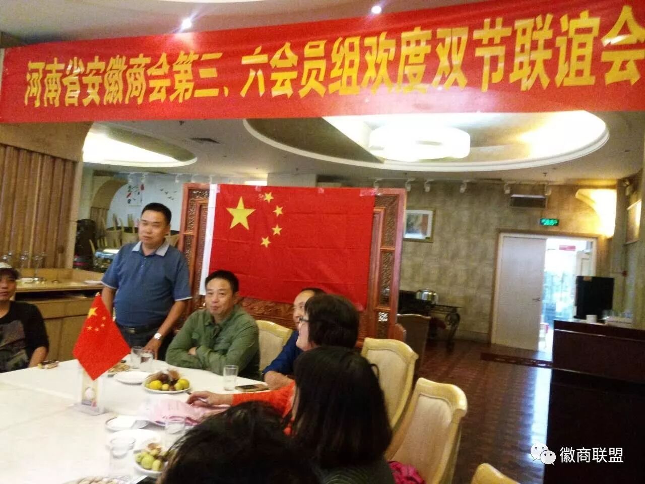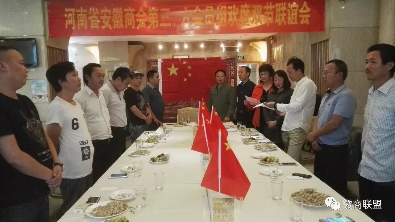 十月一日下午,位于郑州市红专路上的平煤神马集团商务会所一楼大厅内,国旗高挂,欢声笑语,充满欢度佳节的喜庆气氛。河南省安徽商会第三、六组的20余名会员聚在一起,他们面对面,手拉手,感受着亲情、团圆和温馨。执行会长彭井思冒雨赶来,让会员们十分激动,纷纷站起报以热烈的掌声。副会长、第十三会员组组长杨双河,商会副秘书长赵怡敏以及其他组会员黄周庆、郝华明、陈金祥等也兴致勃勃地应邀参加此次联谊活动。